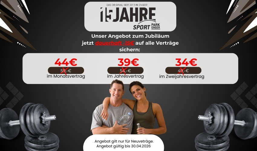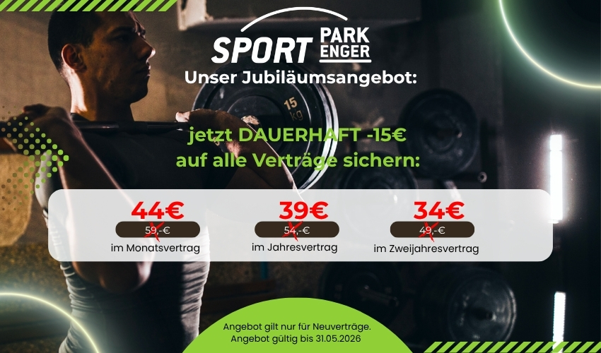 4.200qm Fläche für Sport · Fitness & Gesundheit · über 150 kostenlose Parkplätze · qualifizierte Trainer für Fitness- & Krafttraining · bestes Preis- Leistungsverhältnis der Region · familiär geführter Sportpark · Jubiläumsjahr - 15 Jahre Sportpark ·